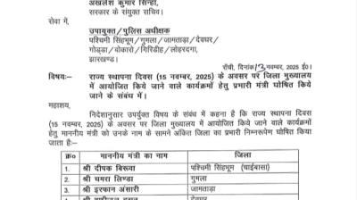 झारखंड स्थापना दिवस : प्रभारी मंत्रियों की सूची में दो बड़े नाम गायब, जानिए क्यों? सियासी गलियारों में हलचल