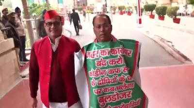 यूपी विधानसभा में सपा का कफ सिरप विरोध प्रदर्शन, पोस्टर पहनकर पहुंचे विधायक
