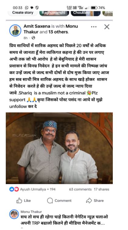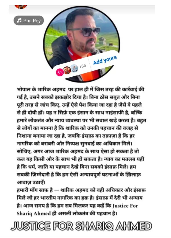भोपाल। फेसबुक और सोशल मीडिया प्लेटफ़ॉर्म्स पर इन दिनों कुछ लोग लगातार सारिक अहमद के समर्थन में अभियान चला रहे हैं। इन पोस्ट्स में यह दावा किया जा रहा है कि सारिक को “न्याय” दिया जाए। लेकिन हक़ीक़त यह है कि सारिक पर कई संगीन अपराधों के आरोप हैं और वह मासूमों की जिंदगी से खिलवाड़ कर चुका है। उसके साथ वाले कुछ लोग उसे सही साबित करने की कोशिश कर रहे हैं जबकि शासकीय कागज से लेकर ऐसी कई FIR उसके खिलाफ भारी पड़ी है। ऐसे लोग समाज के लिए गलत हैं जो एक ऐसे व्यक्ति को बचाने की कोशिश कर रहे हैं। जो केवल समाज के लिए ही नहीं देश के लिए भी घातक को सकते है।