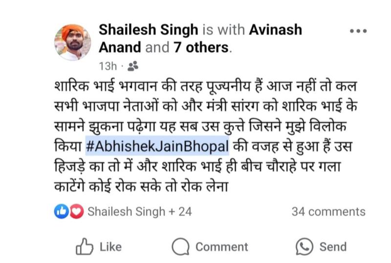 भोपाल। सोशल मीडिया पर भड़काऊ पोस्ट वायरल हो रहा है।शैलेश सिंह नाम के व्यक्ति ने धमकी दी है।शैलेश सिंह पर पहले भी कई अपराध दर्ज हैं शैलेश सिंह शारिक बहुत करीबी माना जाता है। हालांकि शैलेश सिंह ने कुछ देर बाद इस पोस्ट को डिलीट कर दिया।शारिक मछली गैंग से जुड़ा मामला लगातार तूल पकड़ता जा रहा है। सोशल मीडिया पर एक और पोस्ट वायरल हुई है। जिसमें खुलेआम “सर तन से जुदा” जैसी धमकी दी गई है। इस पोस्ट में भाजपा नेताओं और प्रदेश सरकार के एक मंत्री को लेकर भी विवादित बातें लिखी गईं।