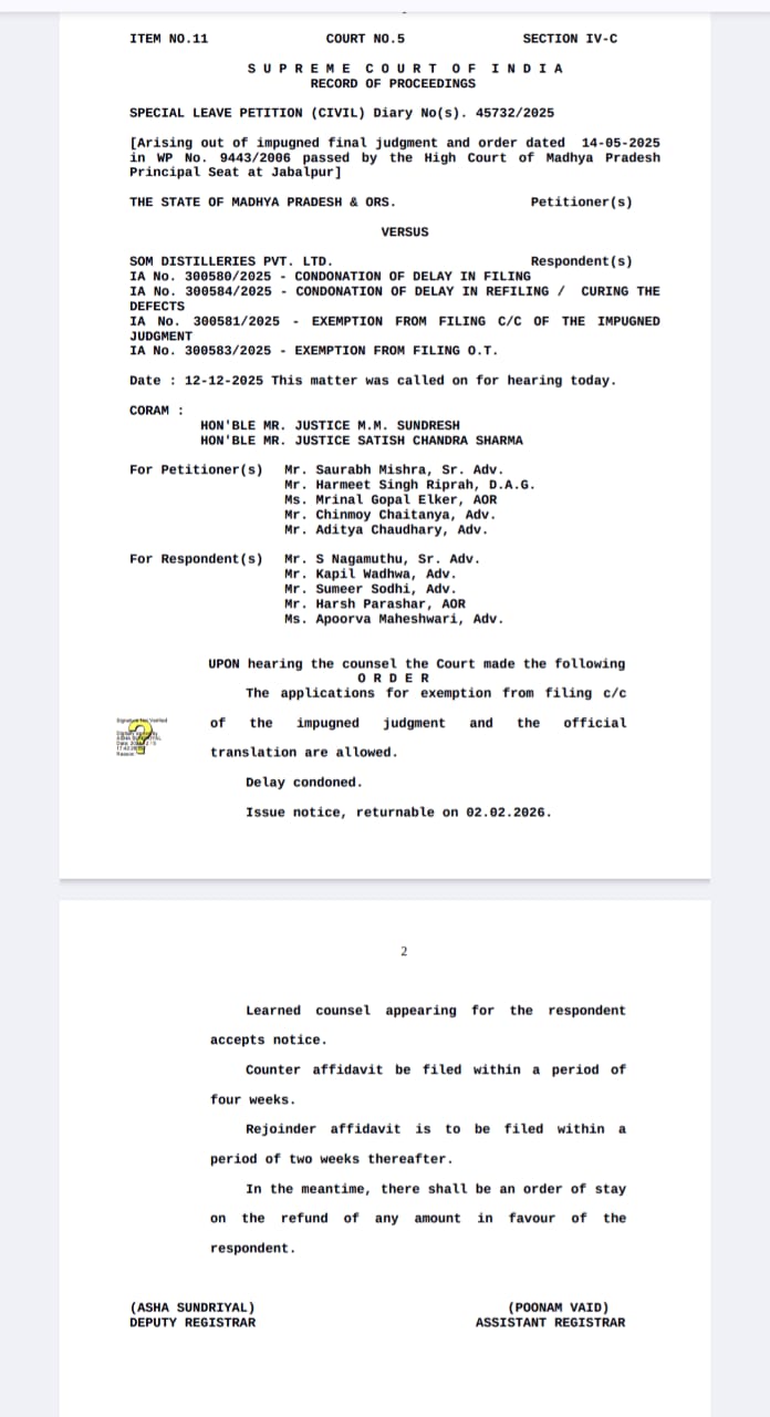 शराब कारोबार की दुनिया में पहले से ही विवादों में रही Som Distilleries Pvt. Ltd. को सुप्रीम कोर्ट से एक बार फिर बड़ा झटका लगा है। राज्य सरकार की याचिका पर सुनवाई करते हुए शीर्ष अदालत ने कंपनी के पक्ष में किसी भी प्रकार की रिफंड राशि पर अंतरिम रोक लगा दी है।