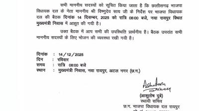 रायपुर : में आज भाजपा विधायक दल बैठक को लेकर राजनीतिक हलचल तेज हो गई है। मुख्यमंत्री निवास पर रात 8 बजे बुलाई गई इस अहम बैठक में छत्तीसगढ़ विधानसभा...