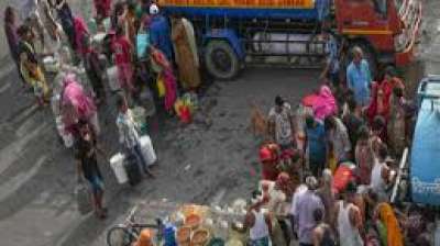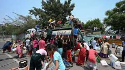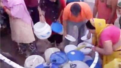 दिल्ली: जल संकट के बीच टैंकर देखते ही टूट पड़े लोग